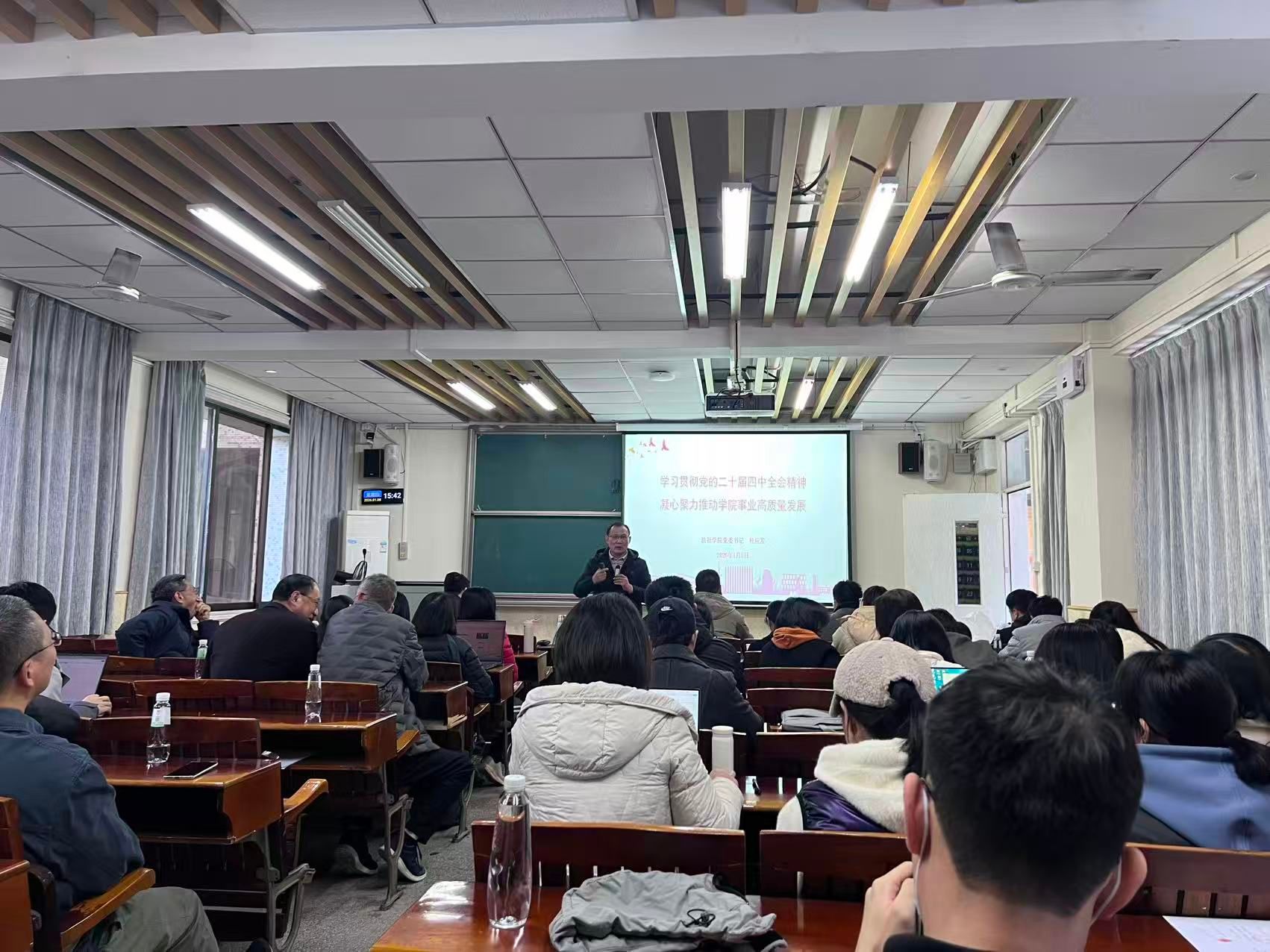 召开全院教职工大会,学院党委书记杜应发带领大家深入学习党的二十届四中全会精神。