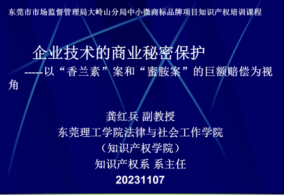 龚红兵副教授于2023年11月7日在大岭山杨屋村村委会为30多家的企业家代表以《企业技术信息的商业秘密保护》为题进行了讲座。